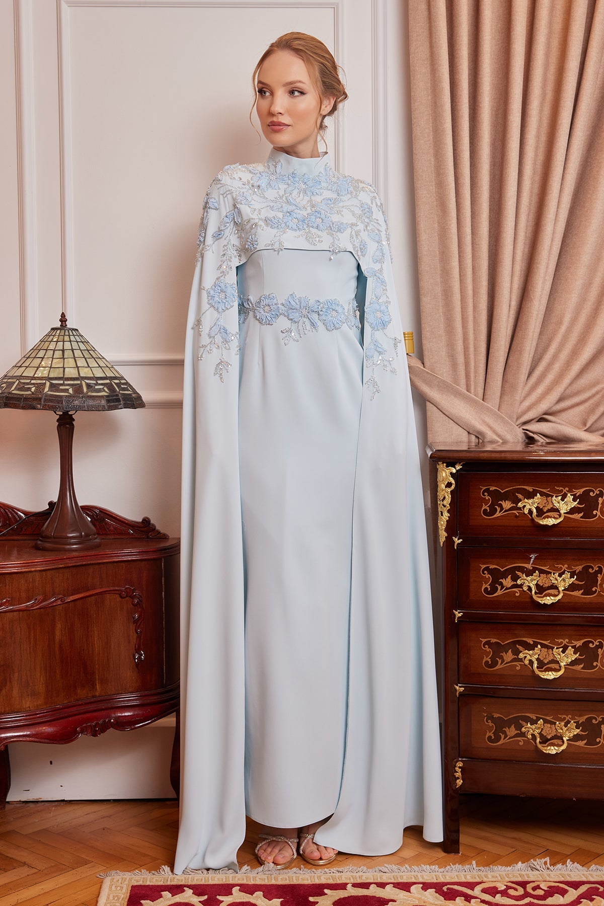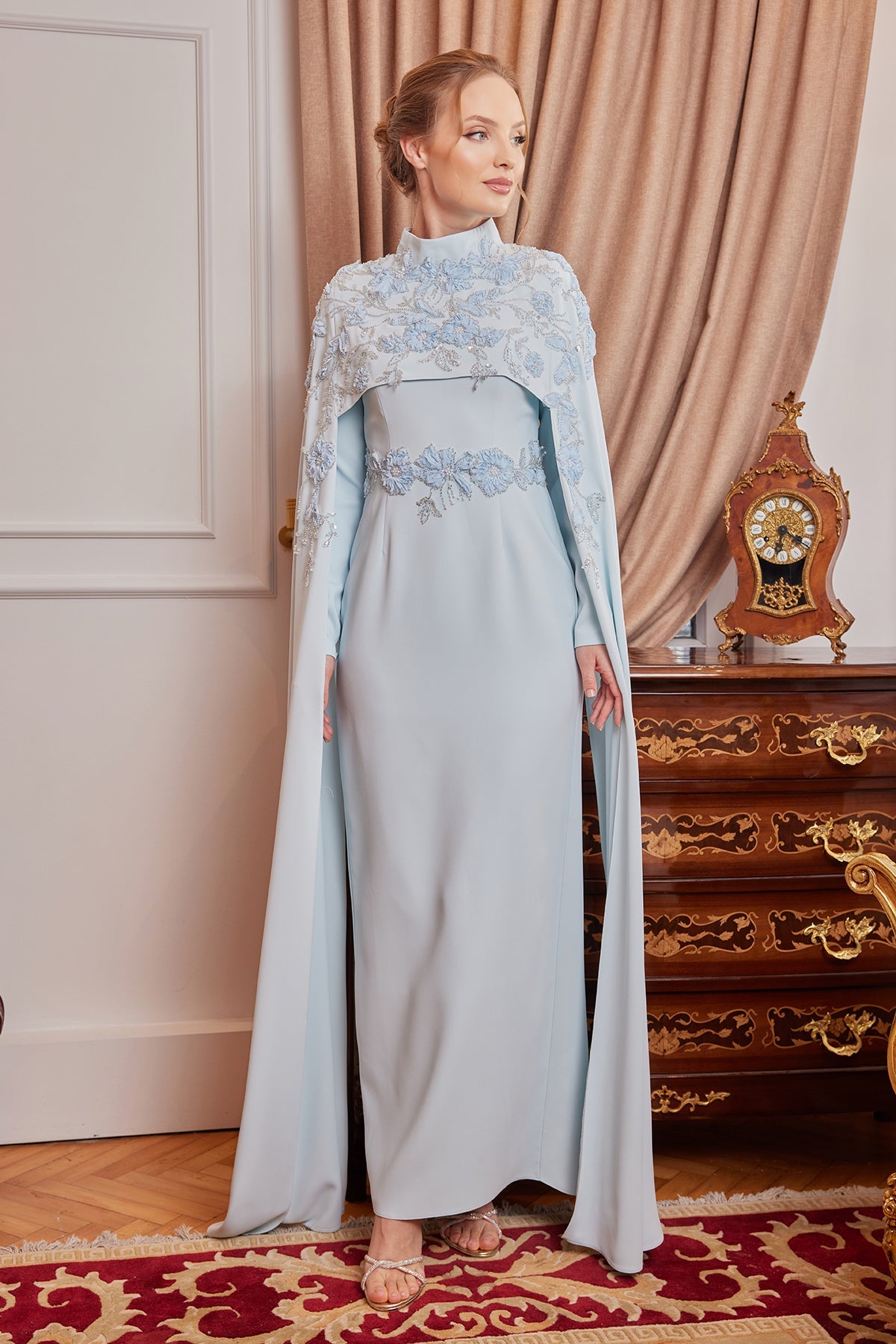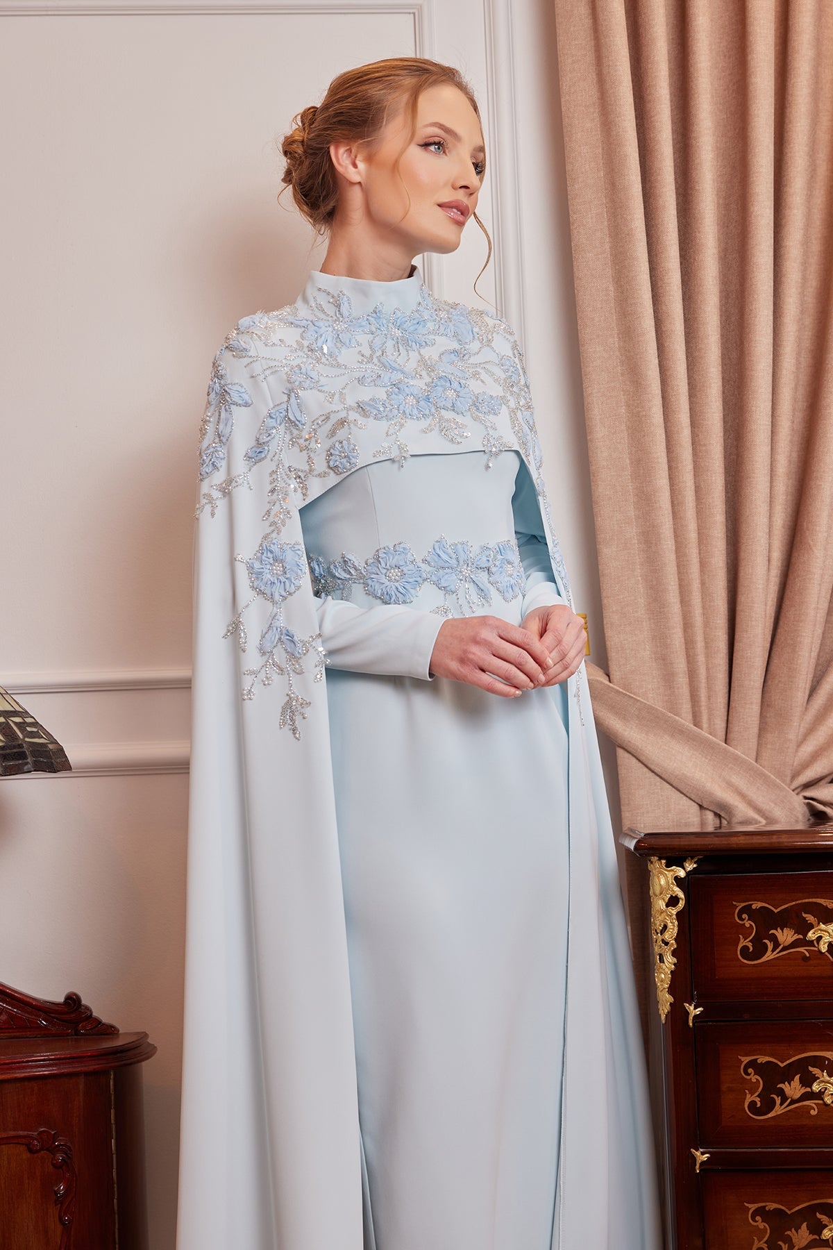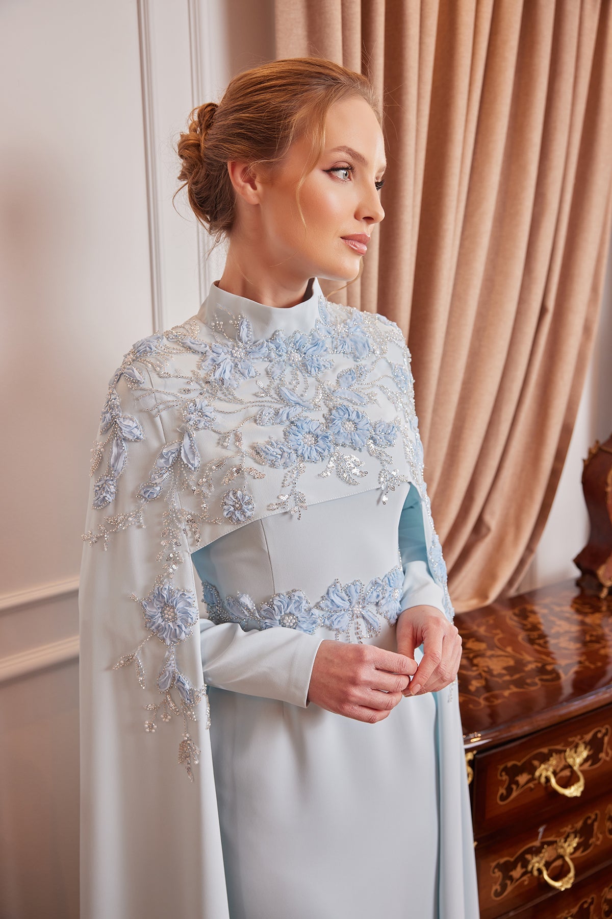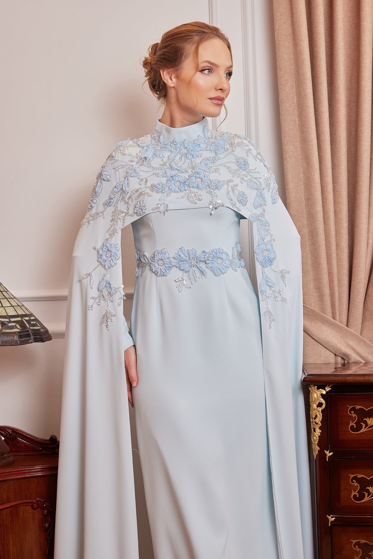 The cape-style top design of the dress offers modern elegance while also adding a strong and fluid look to the posture. The delicate embroidery at the waist elegantly reveals the silhouette, supporting the integrity of the model.