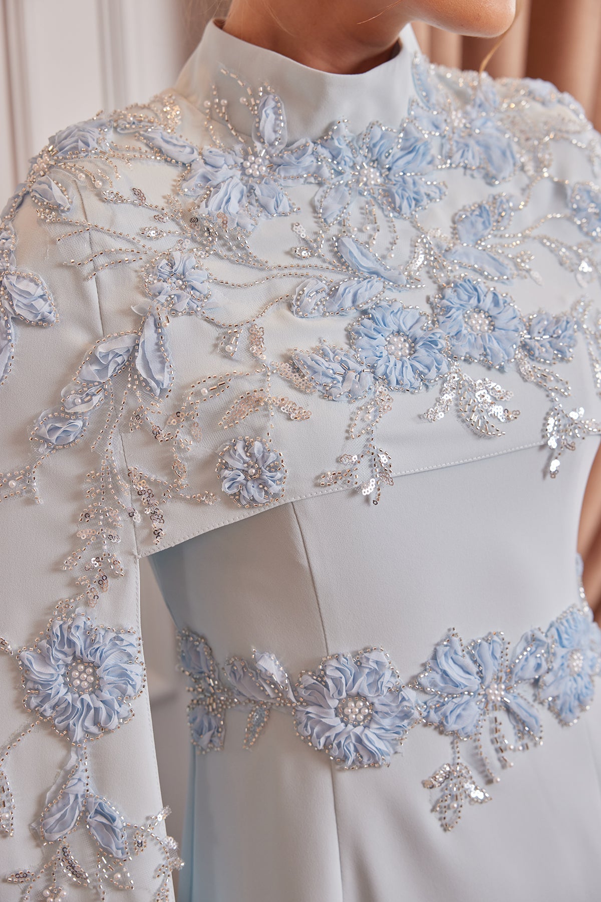 Aleyna Evening Dress in Sky Blue is a special design from My Dreams Collection that combines elegance with details, standing out with its glamorous appearance. The fresh and modern tone of sky blue, combined with the floral embroidery throughout the dress, creates a strong visual impact. The details, starting from the neckline and continuing towards the sleeves and waistline, make the striking silhouette of the model noticeable at first glance.