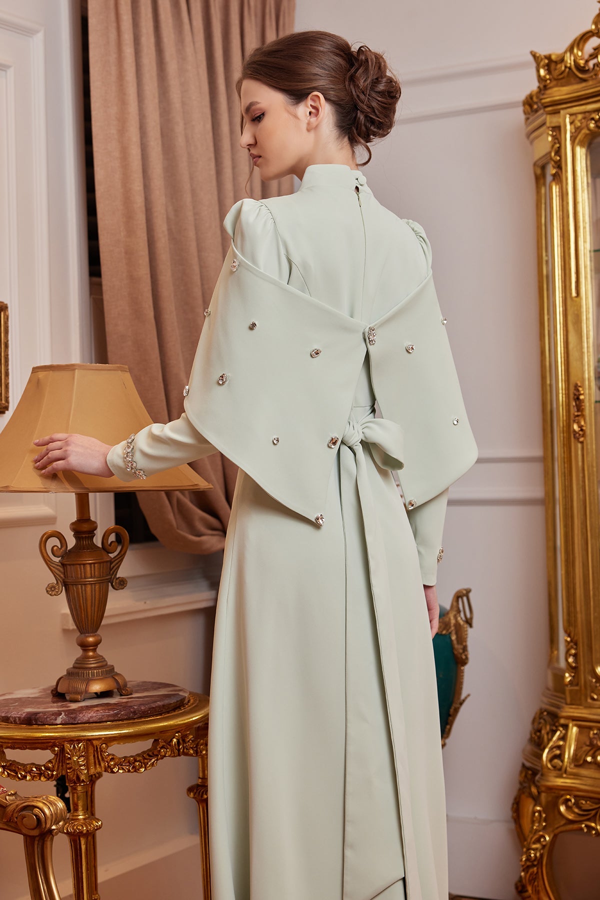 Ayda Evening Dress Mint is a special design from My Dreams Collection that combines elegance with a modern interpretation, dazzling with its sparkling details despite its simple appearance. The fresh and serene tone of mint color, combined with the stone embellishments placed throughout the dress, offers a noble and striking look. The stone details, especially those starting from the shoulders and extending throughout the cape form, emphasize the elegance of the model at first glance.