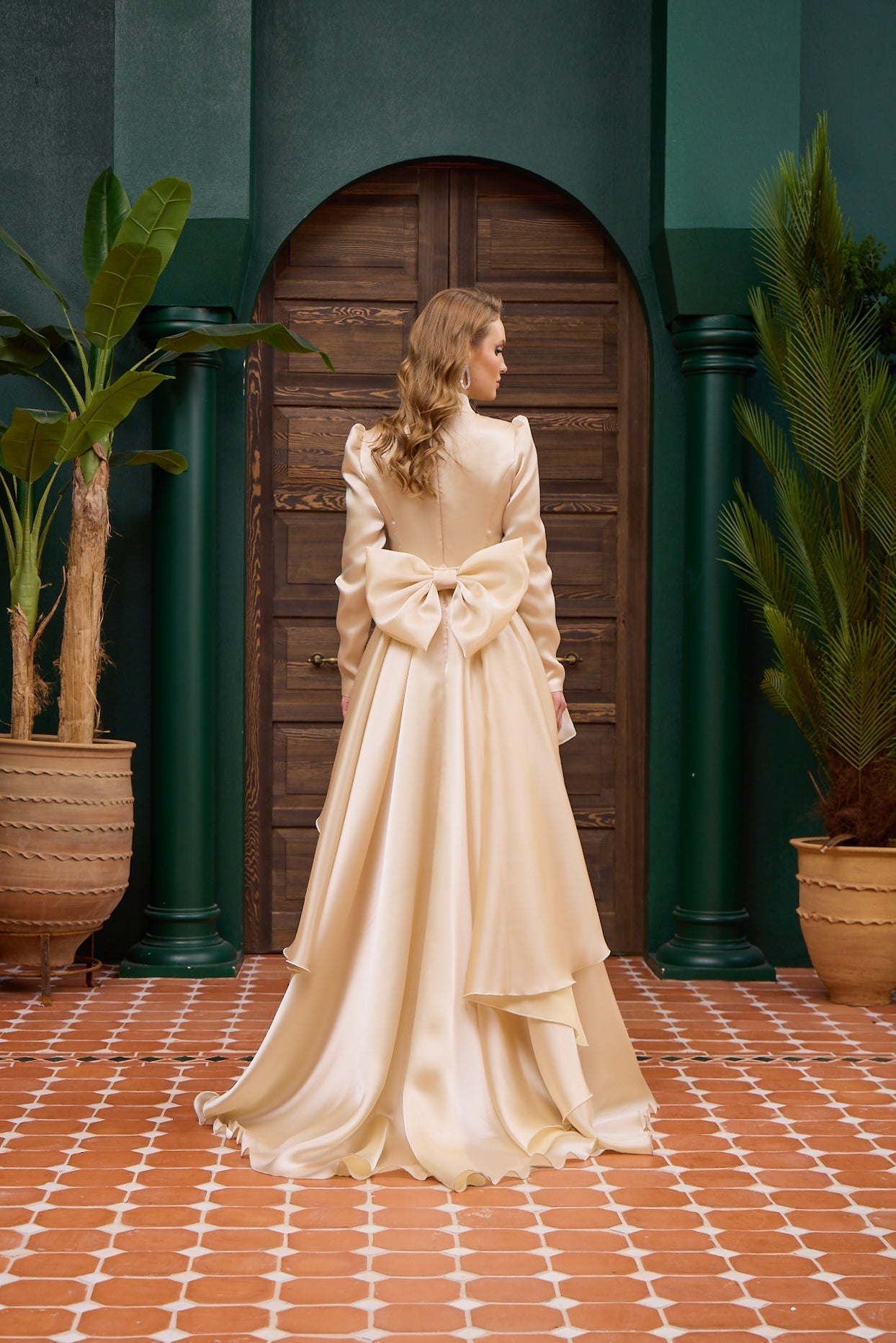 With our specially designed evening gown, which exudes elegance and refinement in every detail, you will find yourself in a different world. With its lines that go beyond the ordinary and its unique touches, this gown is not just a garment, but a work of art through which you can express yourself.