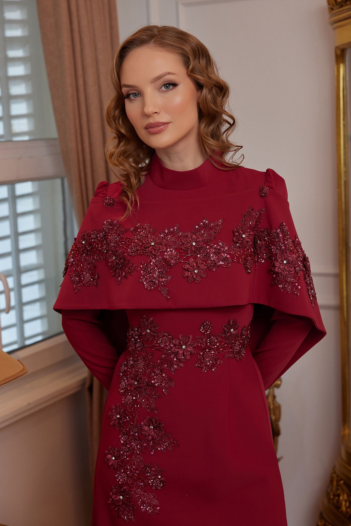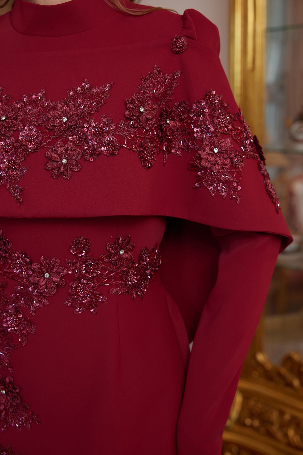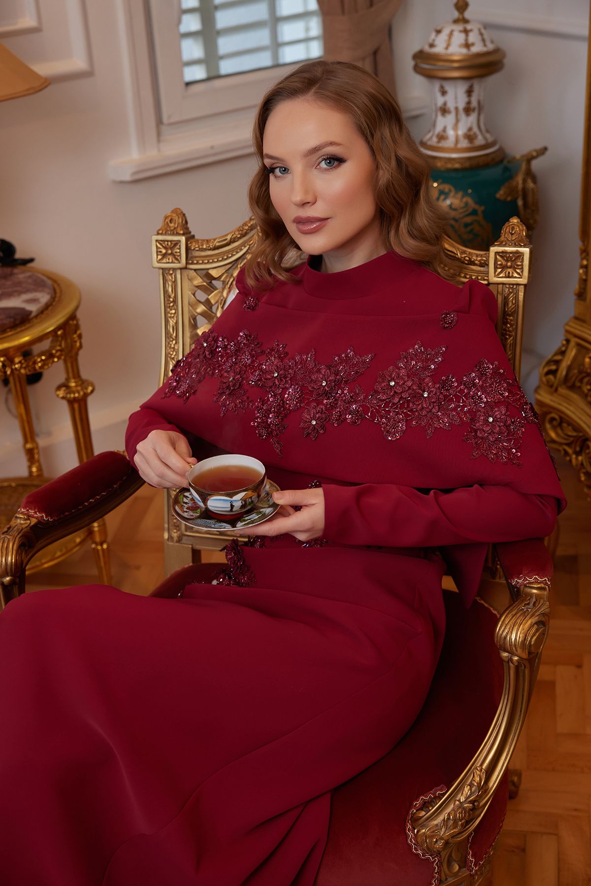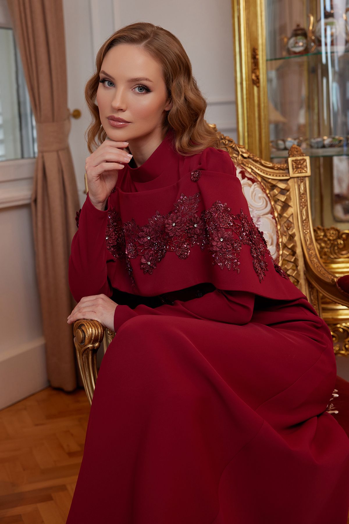 The Gülda Evening Dress in Burgundy is a distinguished evening gown model designed with a special cut concept by My Dreams Collection, featuring elegant details. The noble and impressive elegance of the burgundy color, combined with finely hand-embroidered details, offers both a modern and eye-catching look. This model, a standout for those who prefer specially designed evening gowns, will draw attention to you at special events with its flawless appearance.