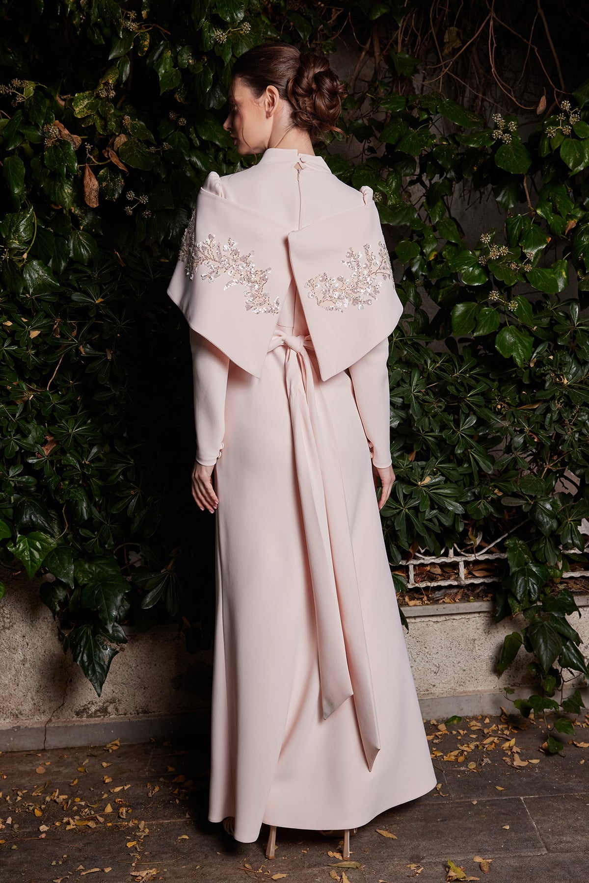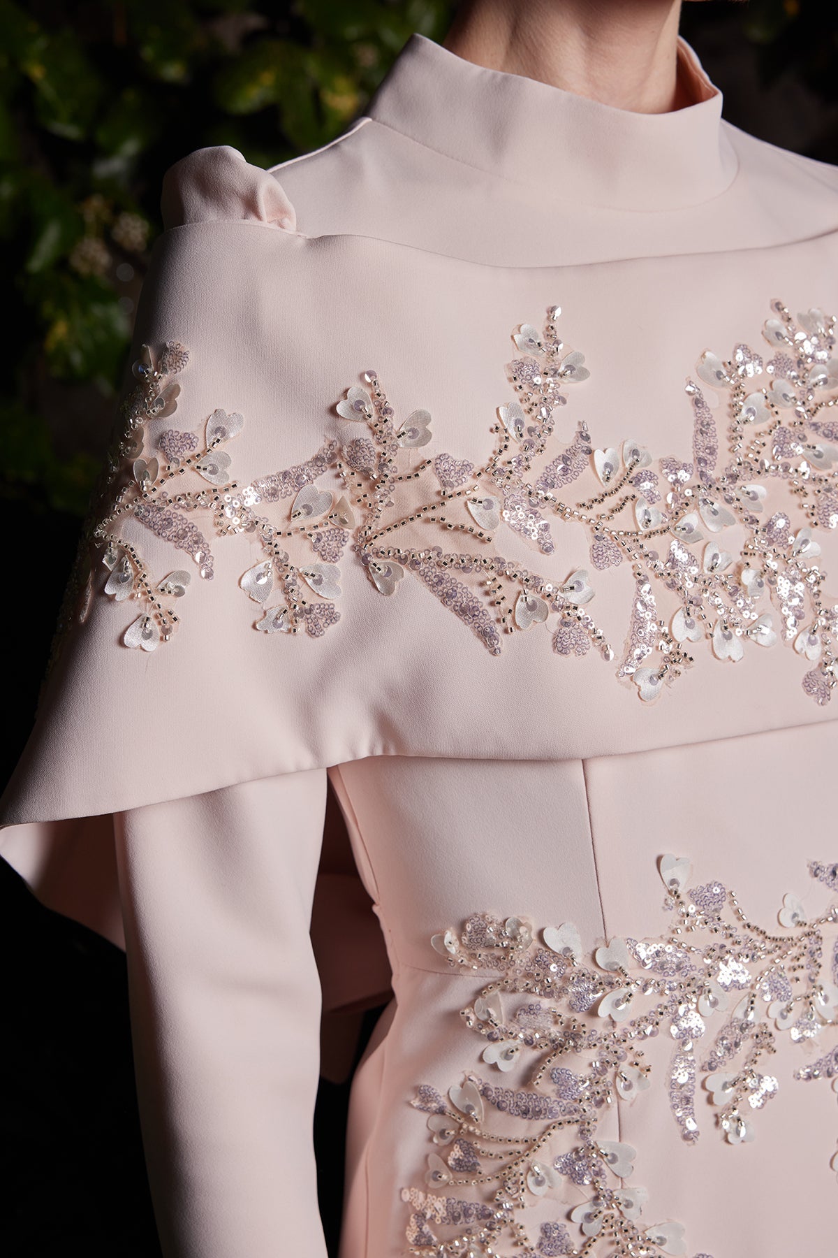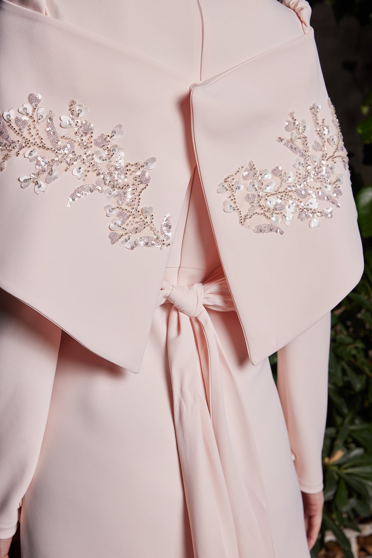 The dress's specially fitted cut elegantly reveals your silhouette, while the cape detail cascading from the shoulder adds a strong character to the design. The hand-embroidered motifs on it reflect light impressively, creating a striking look that retains its sparkle throughout the night.