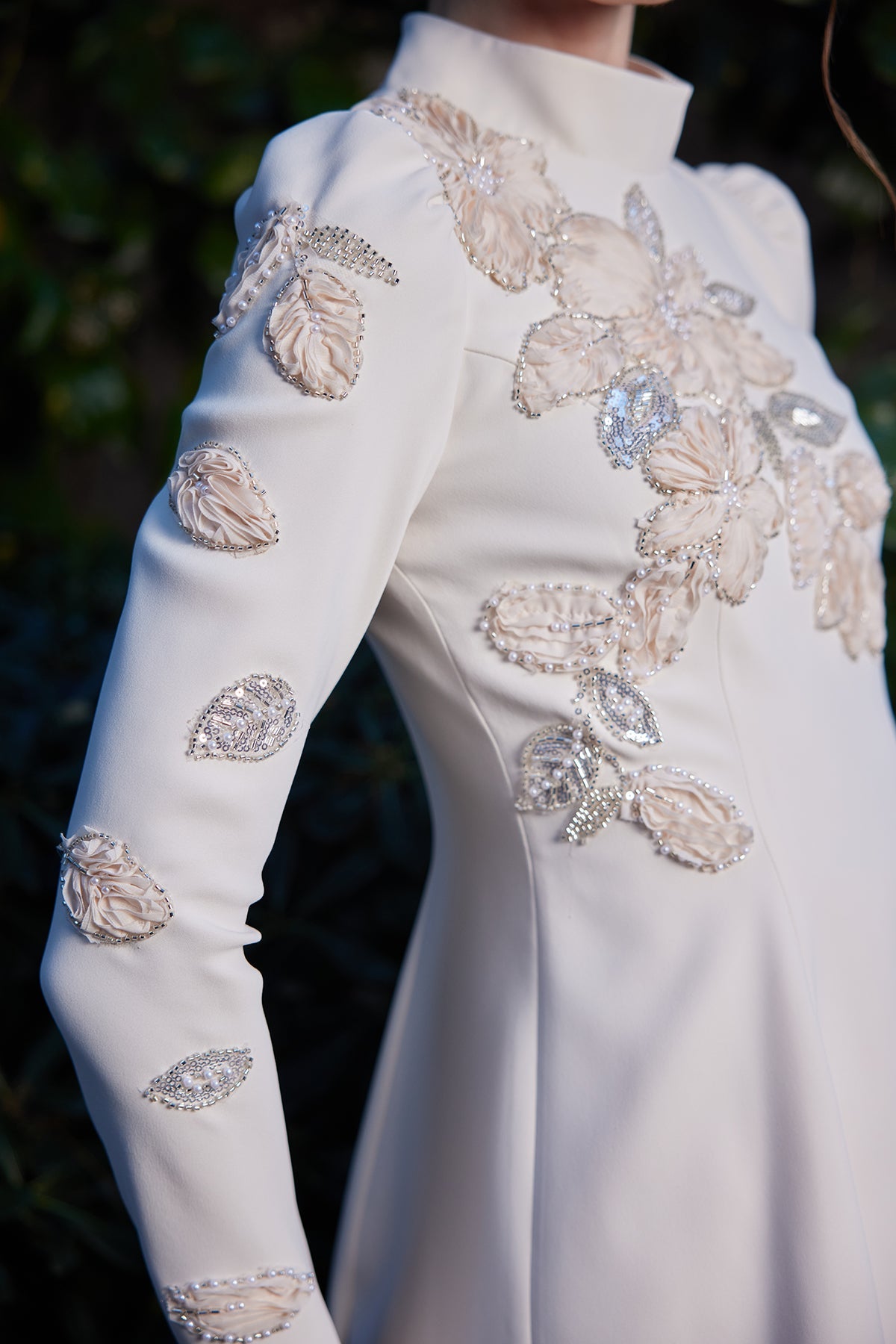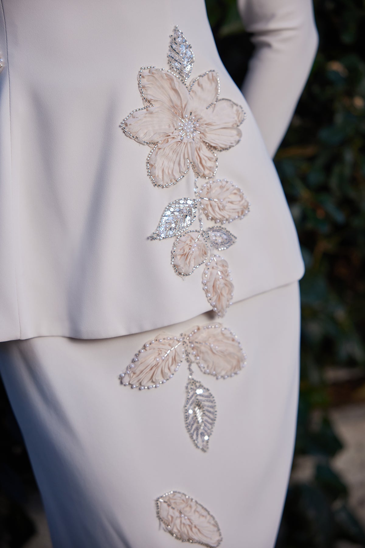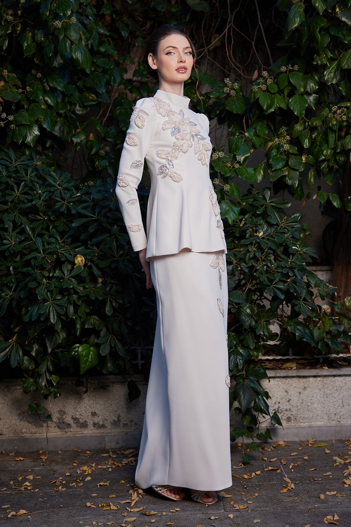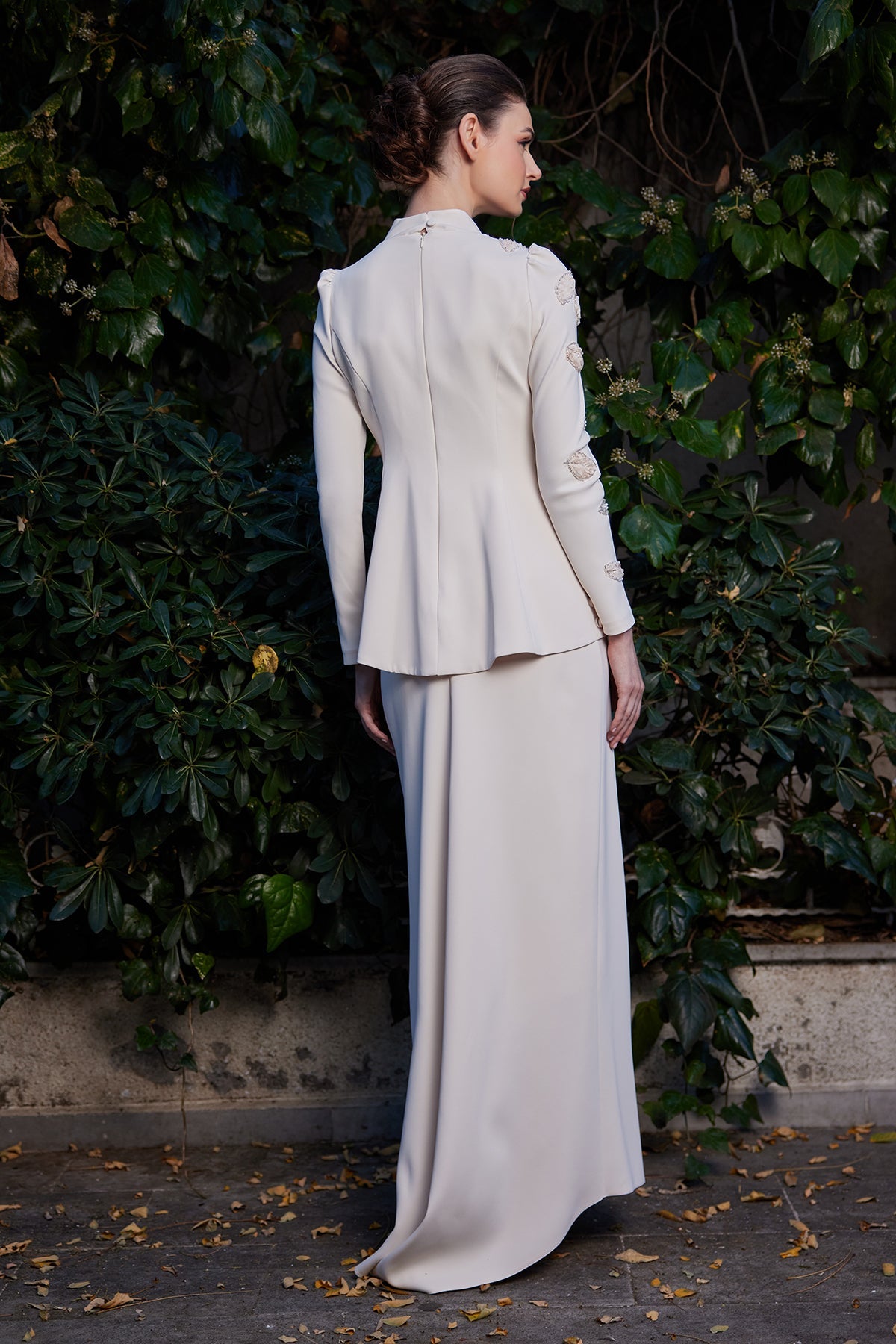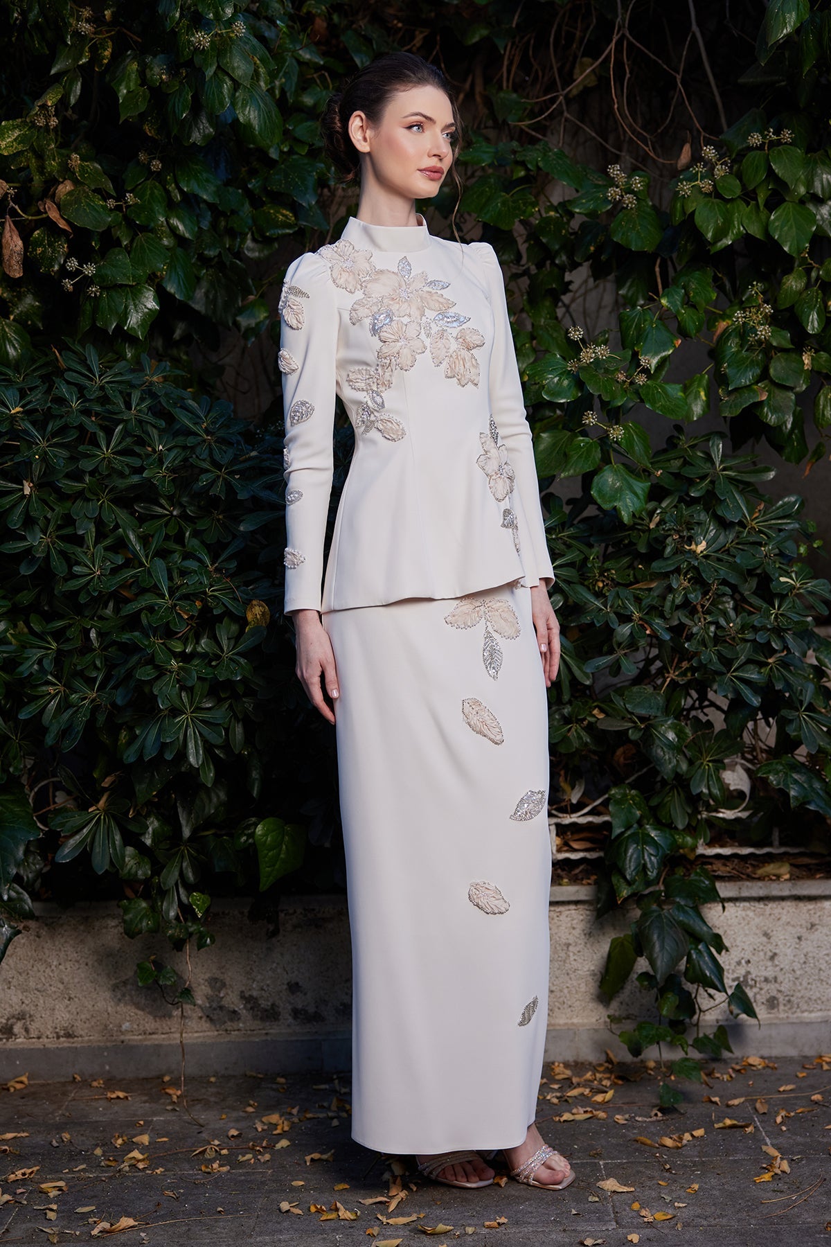 The set's specially fitted cut aesthetically accentuates the waistline, while the flowing skirt creates a balanced and elegant silhouette. The hand-embroidered rose details on the top add a romantic touch to the design, while the shimmering details, in harmony with the beige tone, create an elegant sparkle with the light. Minimal but striking shimmers subtly complete the set's elegance.