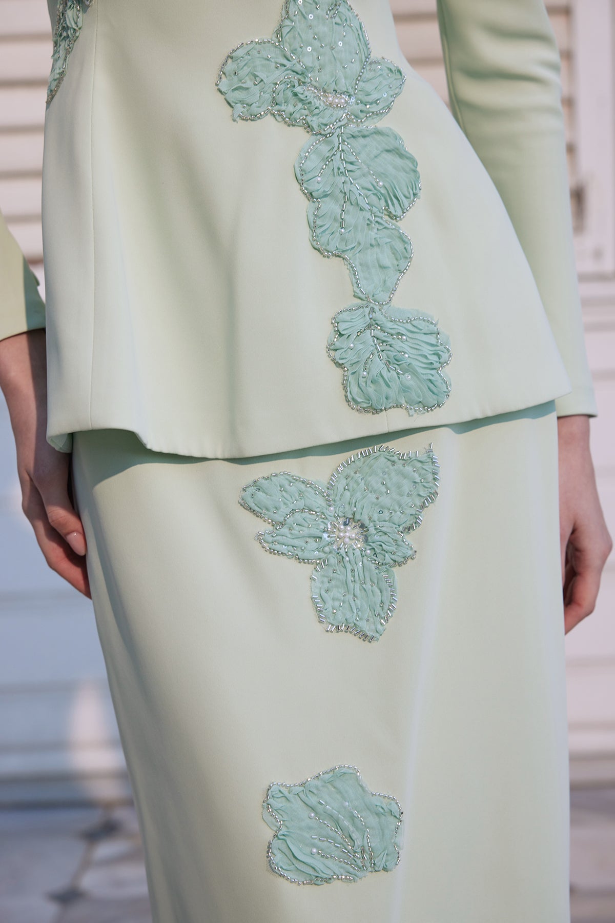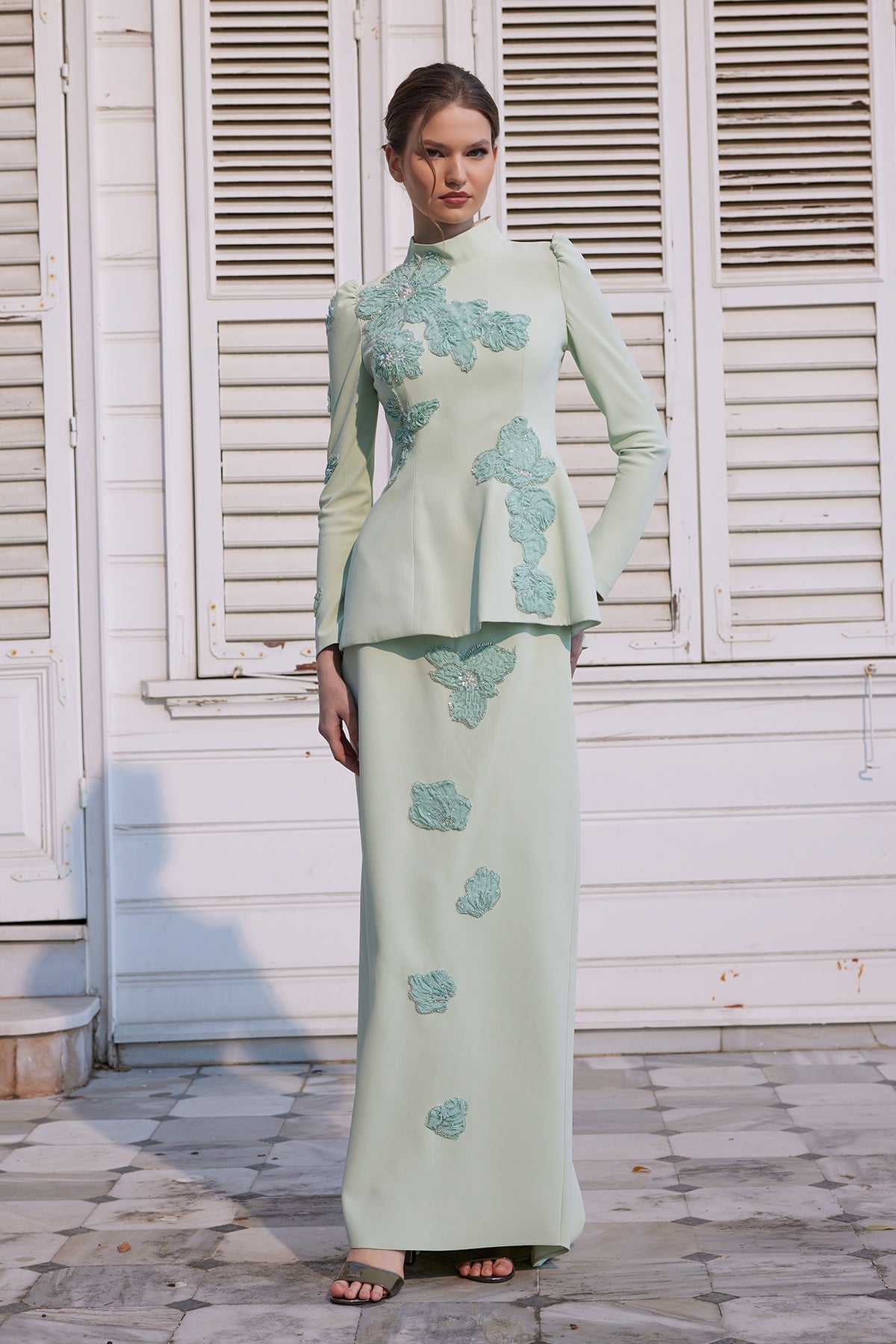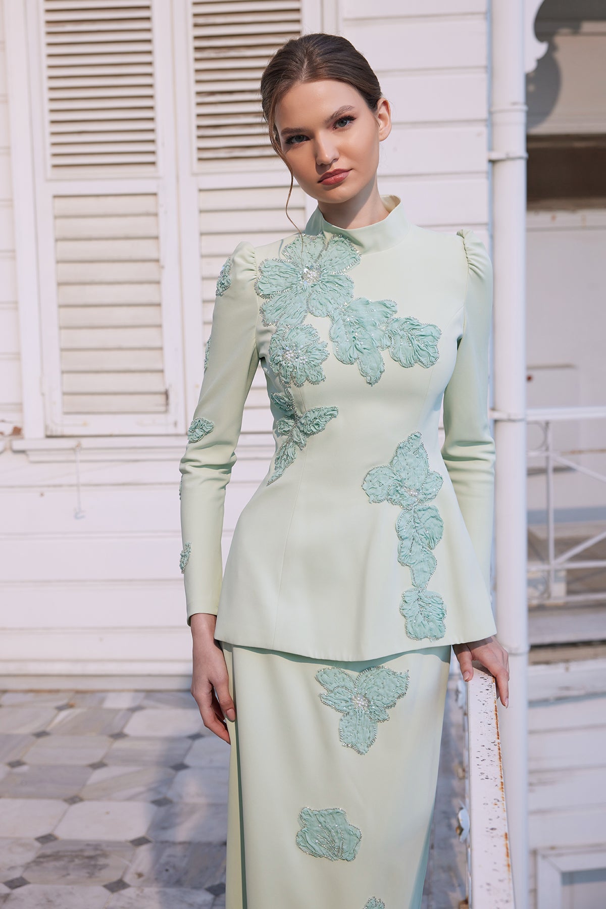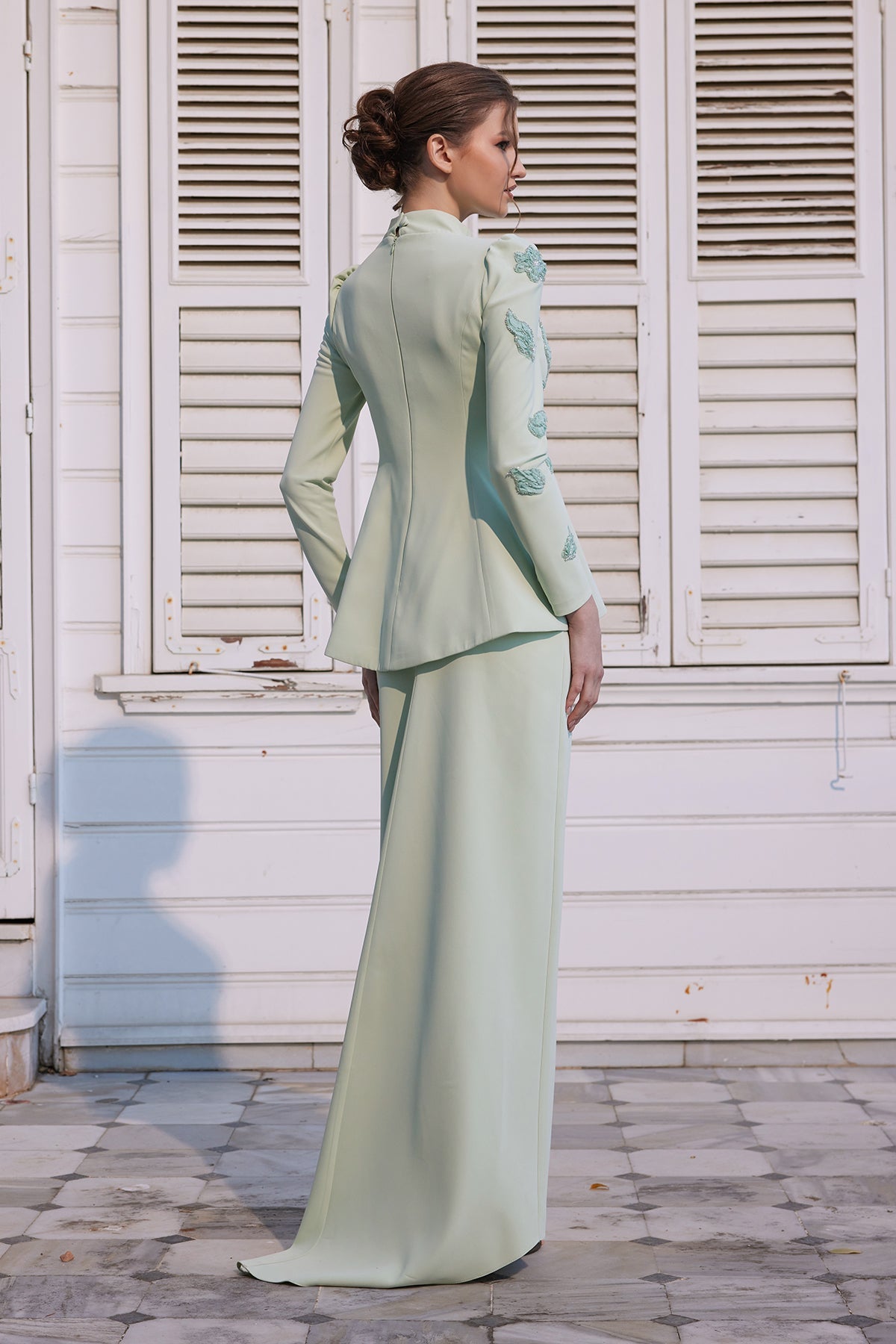 The set's fitted cut aesthetically accentuates the waistline, while the flowing skirt creates a balanced and elegant silhouette. The hand-embroidered rose details on the top add a romantic yet modern touch to the mint tone, providing a soft and elegant shimmer with the light. The finely crafted details complete the set's elegance in a simple yet striking form. The high-quality fabric texture offers a sophisticated look that makes a difference with its posture. Also, offering large size suit options makes the Güllü Suit Mint model comfortable and accessible for every size. This suit, which can be preferred for engagement, wedding, graduation and all special occasions, also exhibits an elegant and fresh look in photo shoots. Offering a fresh and modern elegance, the Güllü Suit Mint is an ideal choice for women who want to combine elegance with fresh tones in their style. Make your elegance unforgettable with this special suit where fine craftsmanship meets the My Dreams Collection difference.