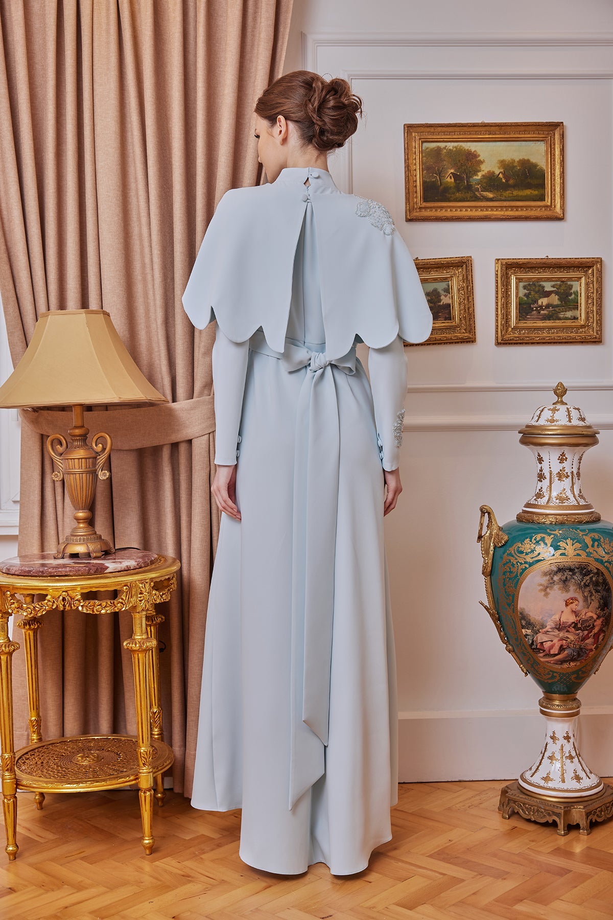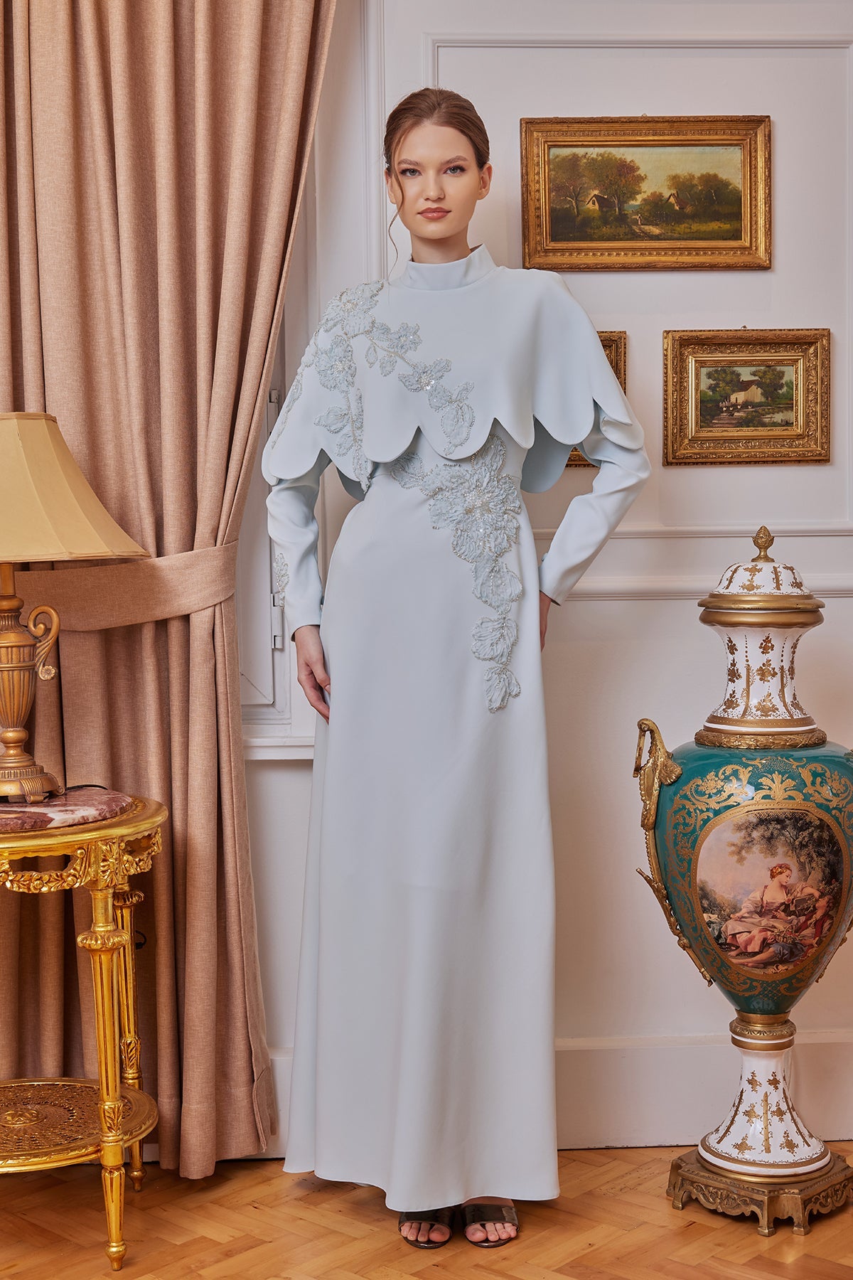 The İlayda Evening Dress in Sky Blue is a distinguished design from My Dreams Collection that combines elegance with modern details and stands out with its special craftsmanship. The calm and sophisticated tone of sky blue meets the floral embroidery carefully placed throughout the dress, creating a strong aesthetic unity. The cape-style design, extending from the shoulder downwards, offers both a romantic and exclusive silhouette thanks to its wavy cut.