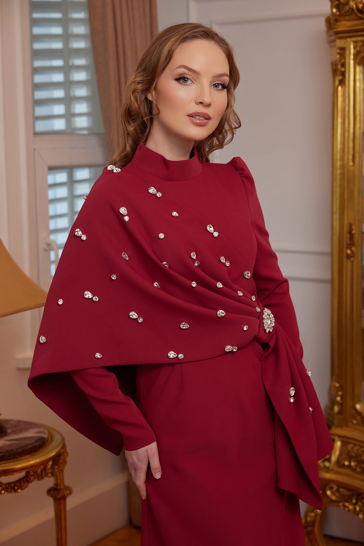 The Nilda Evening Dress in Burgundy is one of the eye-catching designs from My Dreams Collection that reflects the noble and powerful stance of the collection. The deep and striking shade of burgundy, combined with the delicately scattered stone details on the dress, offers a dazzling elegance. The draped bodice perfectly hugs the body line, while the stone-embroidered brooch detail creates a striking accent at the center of the design.