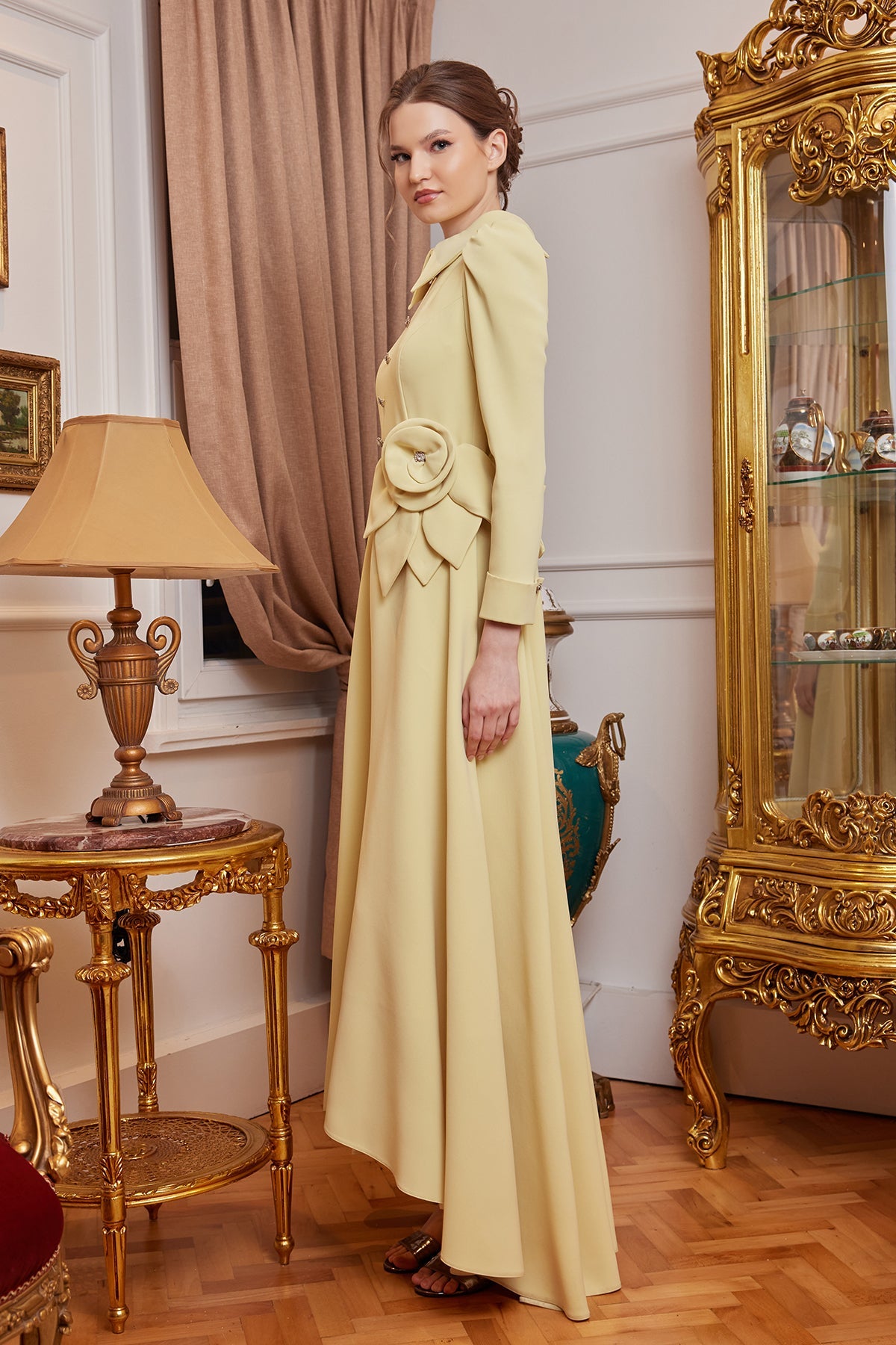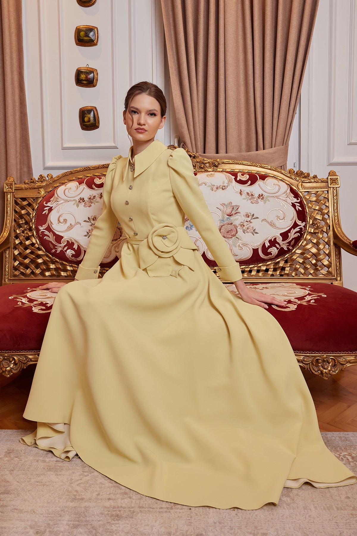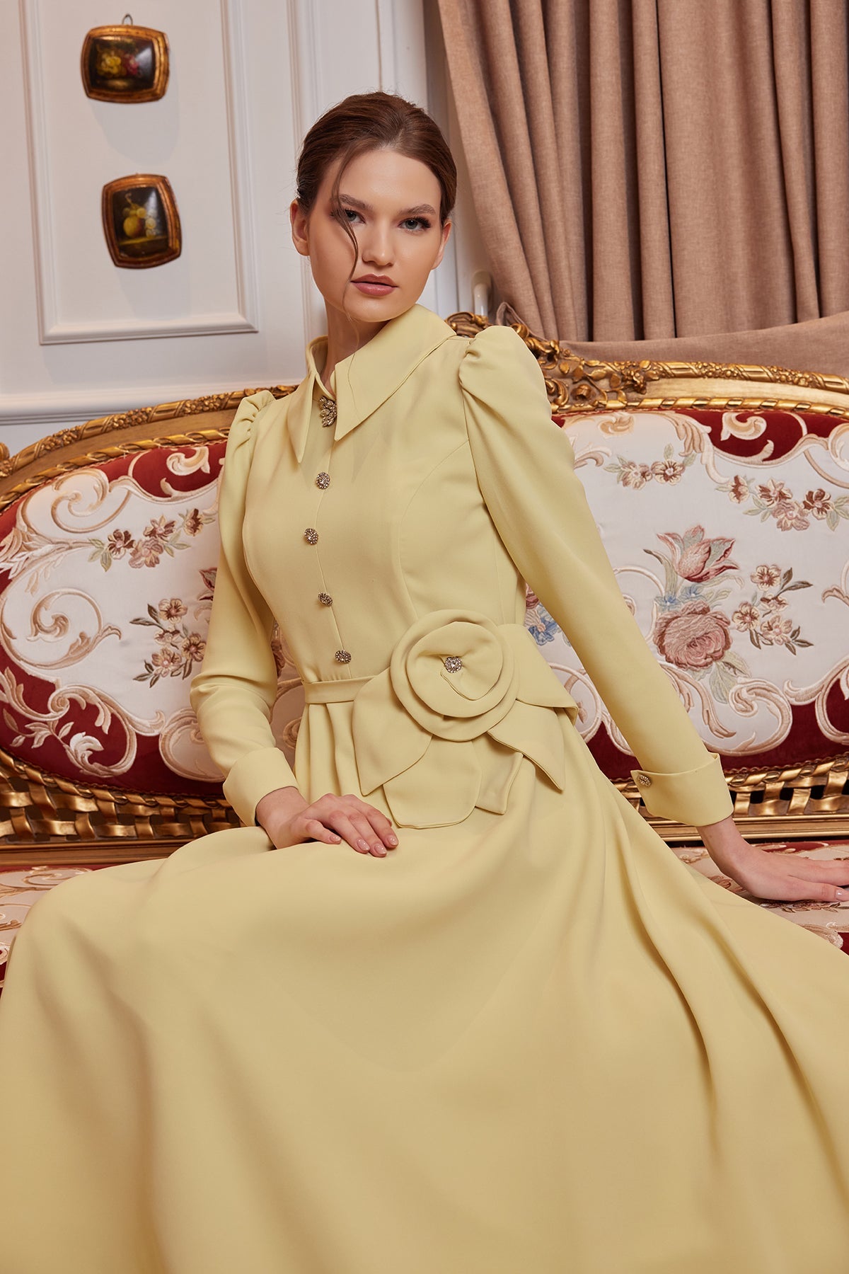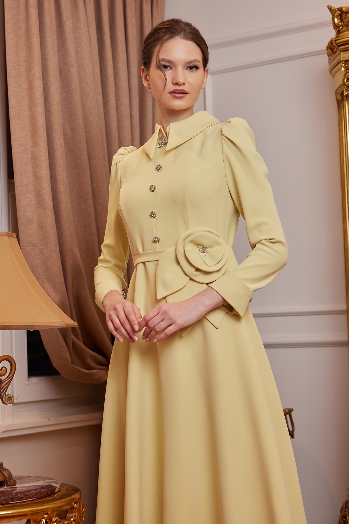 The Peyker Evening Dress in Yellow is one of My Dreams Collection's special designs that interprets classic elegance with modern touches. The soft and noble look of the yellow tone, combined with the stone-detailed buttons and the elegant floral accessory at the waist, creates an extremely elegant silhouette. The sparkling brooch at the neckline stands out as a striking detail that adds character to the dress.