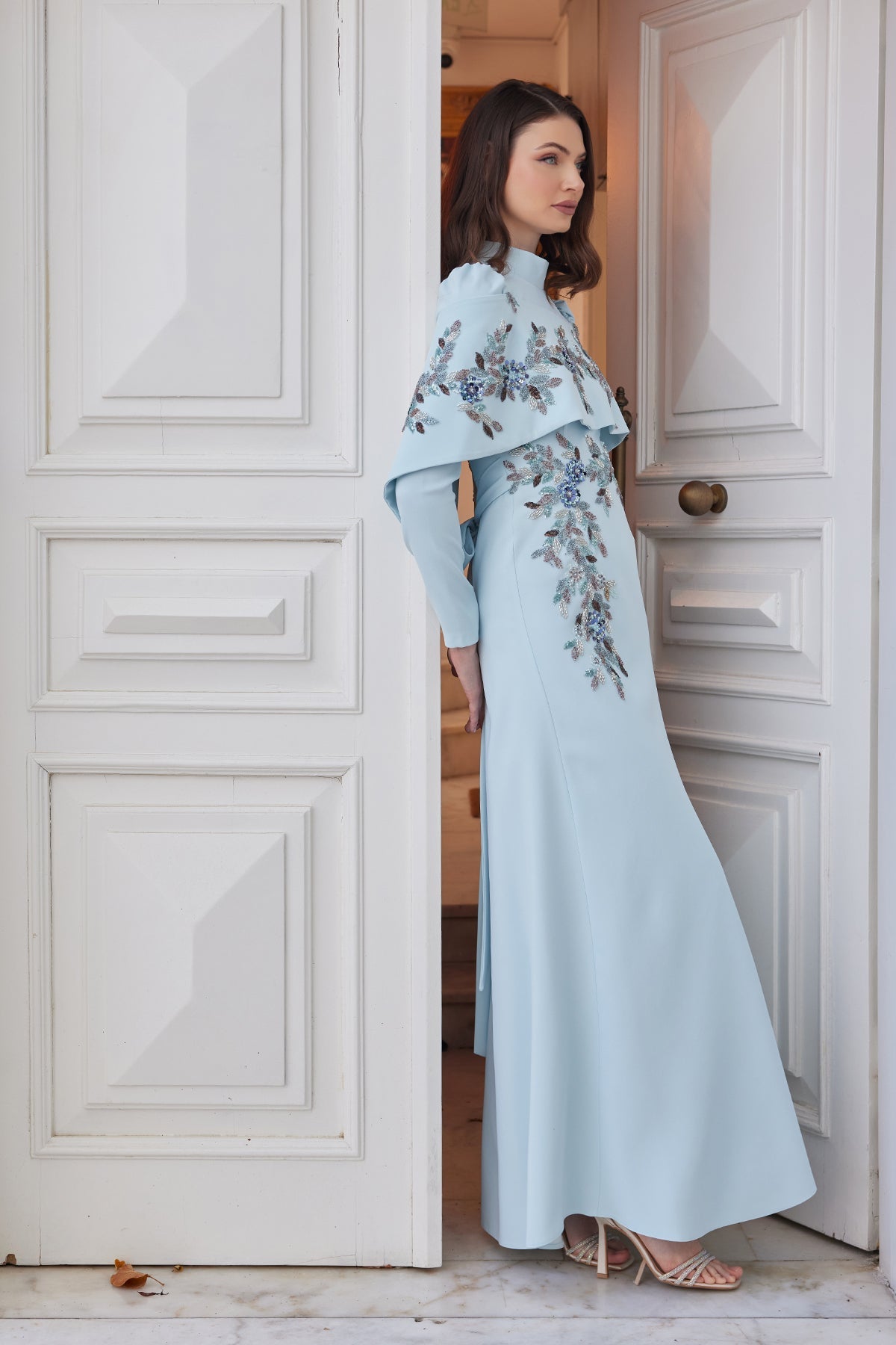 Selda Evening Gown Sky Blue is a special design from My Dreams Collection that combines modern elegance with eye-catching details. The fresh and noble tone of sky blue, combined with three-dimensional embroidery throughout the dress, creates an impressive look that reflects light from every angle. The cape-style top design distinguishes the model from classic evening gowns, offering a strong, flowing, and sophisticated silhouette.