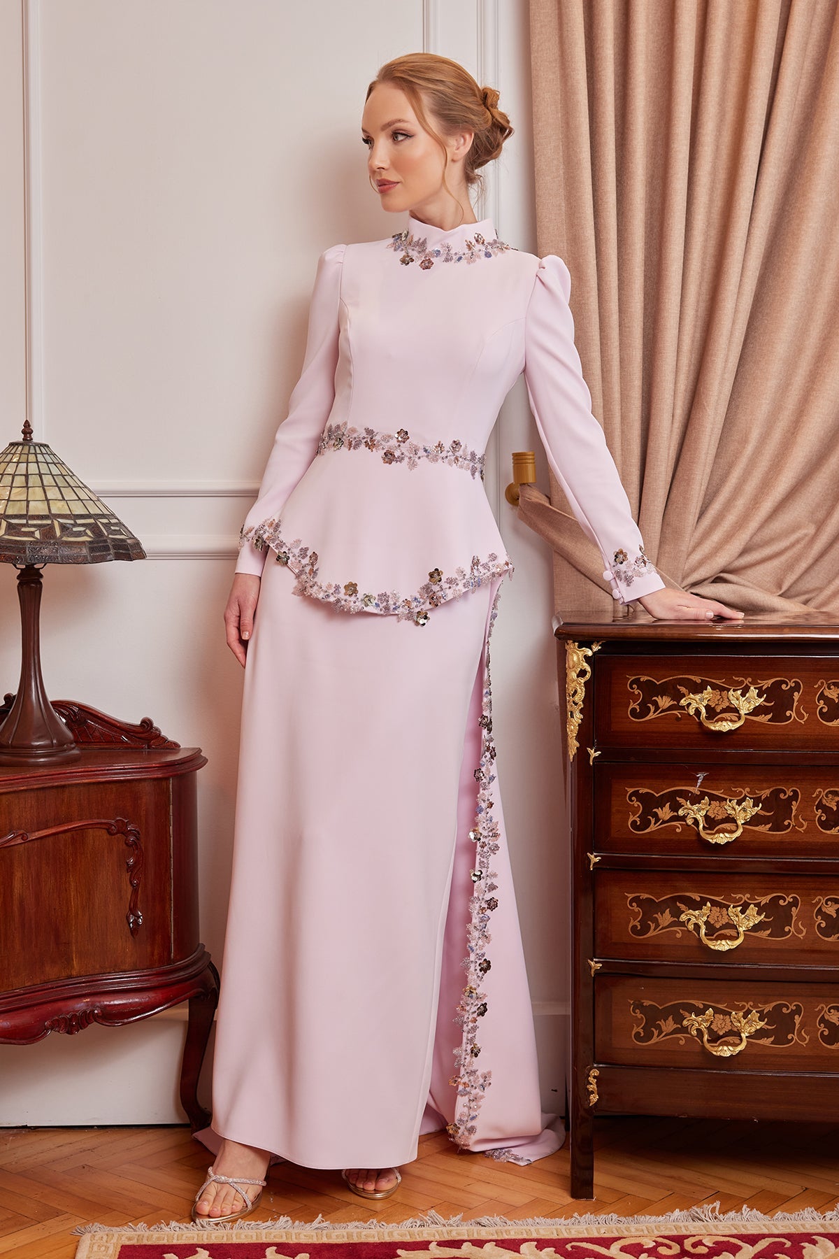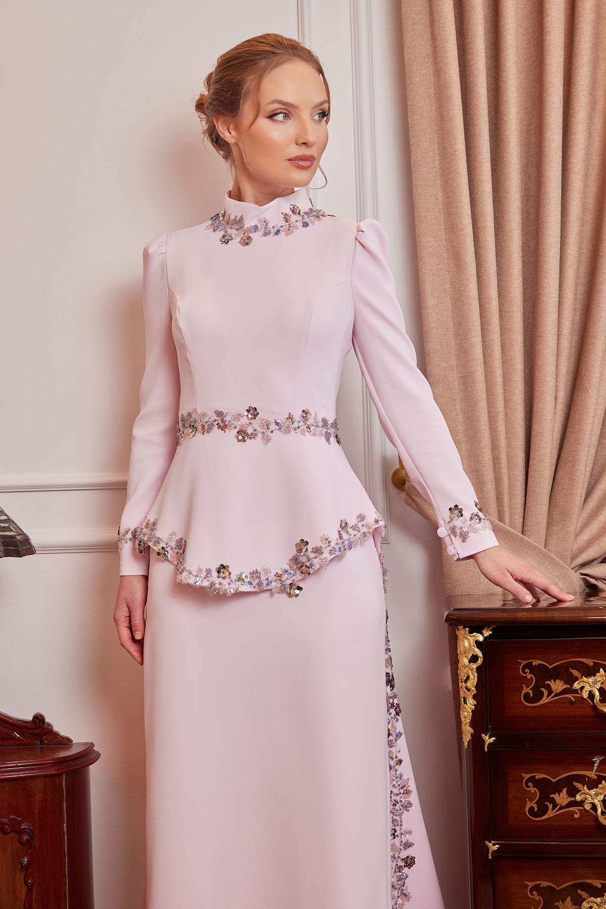 The Selena Evening Dress in Powder Pink is one of My Dreams Collection's special designs that combines elegance with romantic details. The soft and elegant look of the powder pink color is complemented by floral embroidery on the neckline, waistline, and hem of the dress, offering feminine sophistication. The shimmering touch of lace flowers crowns the design's simple silhouette with elegant glamour.