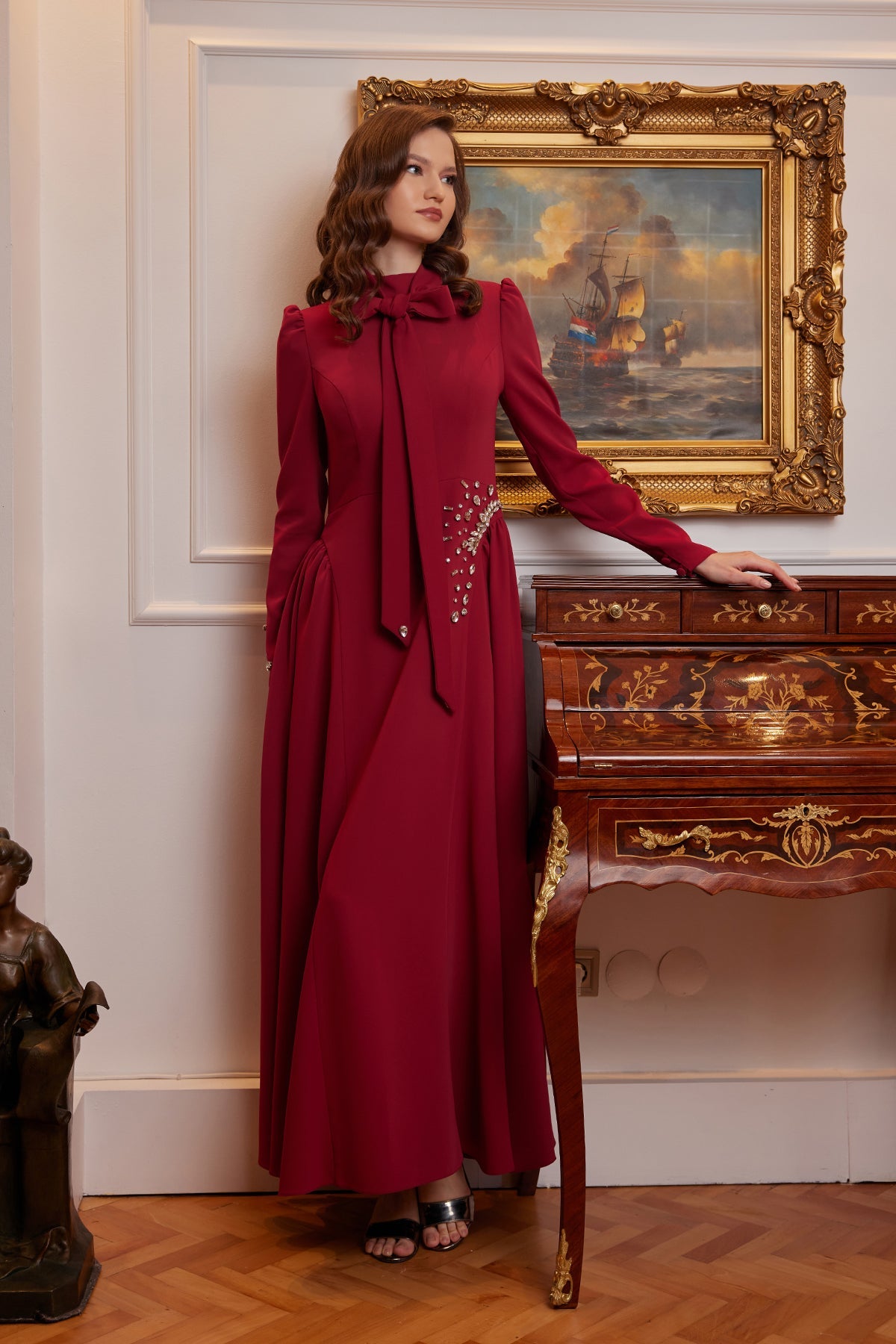 The elegant bow detail at the neckline adds a romantic and unique touch to the dress, drawing all eyes to you. It is an ideal choice for those who want to stand out with the power of the noble burgundy tone at weddings, engagements, special occasions and all elegant events. Timeless, eye-catching and flawless.