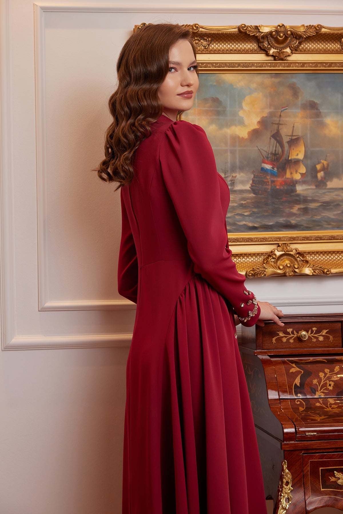 The Talia Evening Dress in Burgundy dazzles with its special design that blends modern elegance with classic grace. The elegant drapes on the bodice and the stone embellishments that perfectly reflect the light give the dress both a distinguished and sophisticated look. The finely crafted, individually placed stone details transform the evening dress into a couture piece.