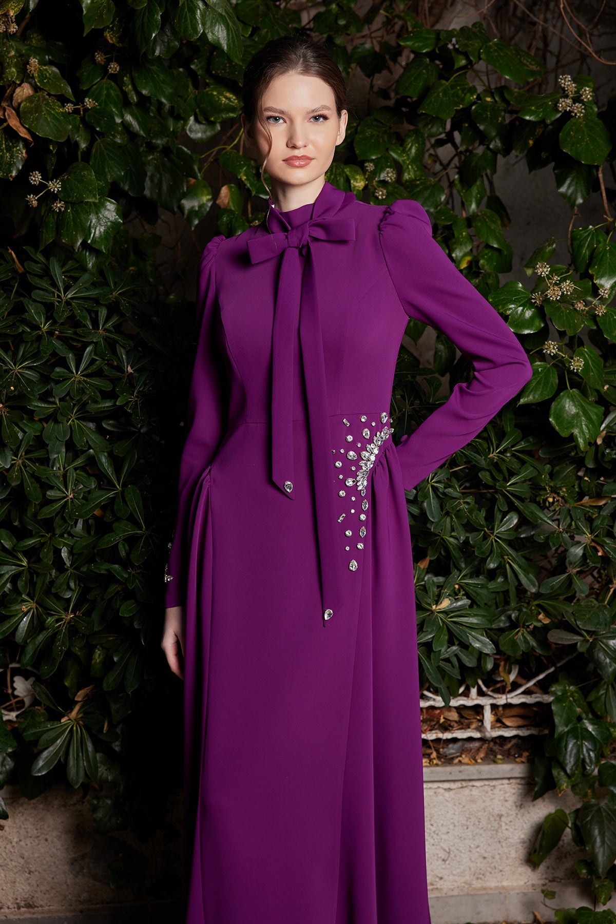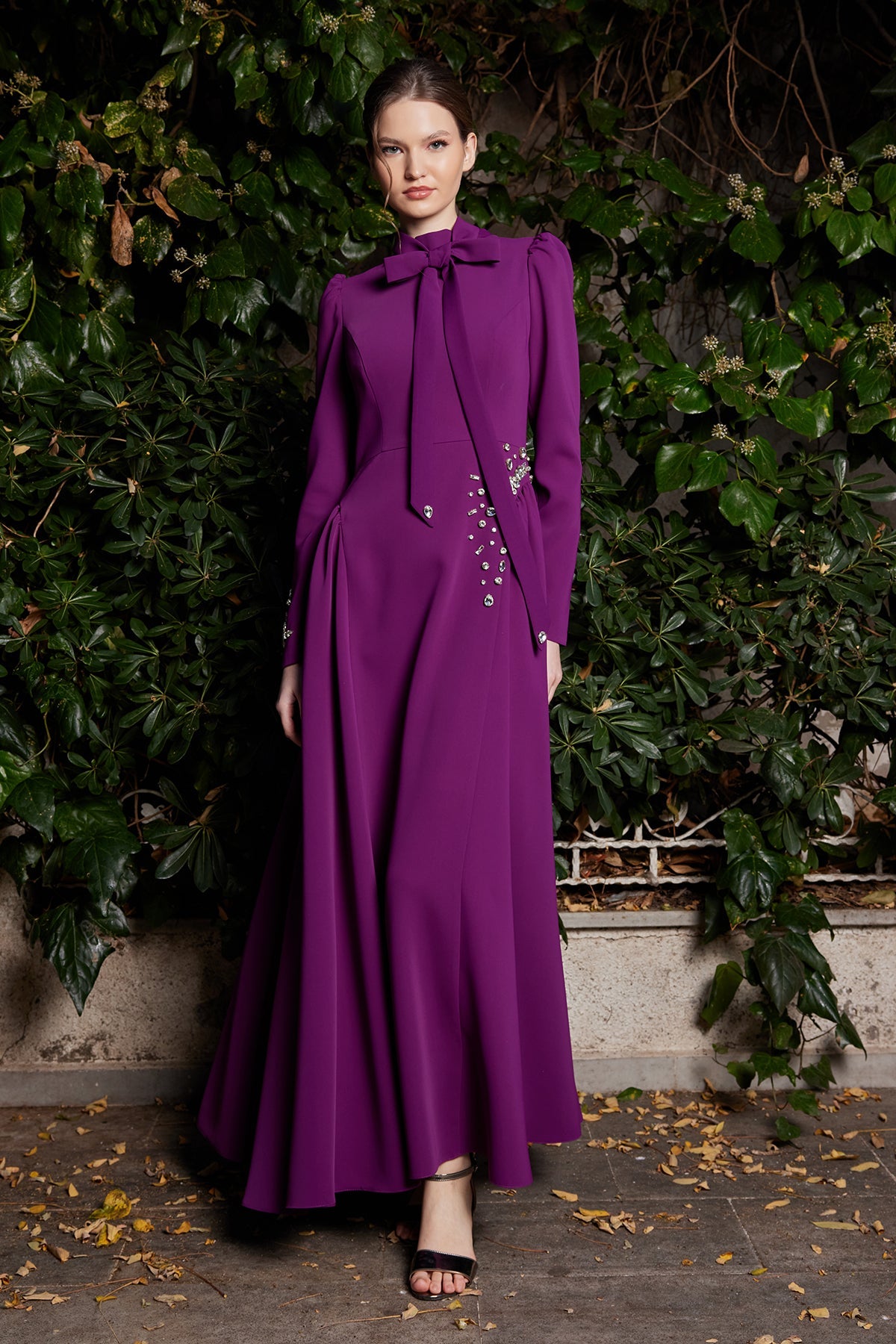 Talia Evening Dress draws attention with its aesthetic posture that reveals the body lines with subtle elegance, while the flowing structure of the skirt adds elegant movement to the walk. The elegant volume at the shoulders gives the dress a modern silhouette, while the stone embellishments at the waist and sleeve cuffs catch the light, providing a sparkling look with every step.